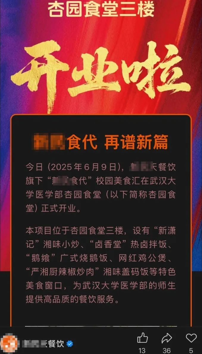 在相关帖子评论区,有IP为湖北的网友表示,该店是“武汉大学医学部三楼新开的店子。”记者通过查询发现華鑫證券,6月9日,某餐饮公司官方公众号发文称:“今日 (2025年6月9日),某某天餐饮旗下 “某某食代” 校园美食汇在武汉大学医学部杏园食堂 (以下简称杏园食堂) 正式开业。本项目位于杏园食堂三楼,设有 “新潇记” 湘味小炒、“卤香堂” 热卤拌饭、“鹅飨” 广式烧鹅饭、网红鸡公煲、“严湘厨辣椒炒肉” 湘味盖码饭等特色美食窗口,为武汉大学医学部的师生提供高品质的餐饮服务。”